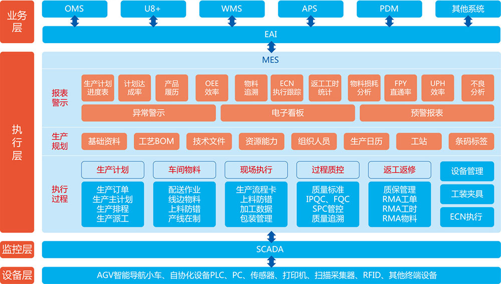 智能制造不但要生產自動化、信息化,更需跨業務層級整合信息系統,實現業務層、執行層、監控層、設備層的互聯互通。MES系統是鏈接業務層與設備監控層的橋梁,通過MES可以實時掌控生產進度與監控異常。